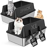 TEVILA 2 Pack XL Stainless Steel Litter Box with High Sides Shield for Multi Cat, Extra Large Tall Wall Open Top Deep Metal Pan for Big Cats, Anti-Leak Non-Stick Odor Control, 2 Scoops Included, Black