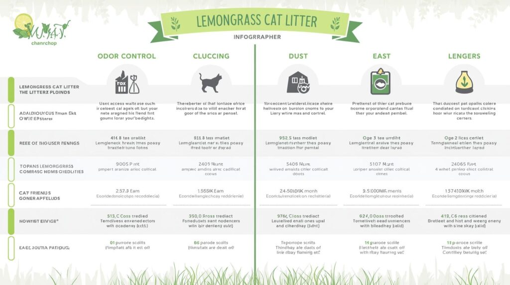 Choosing the right cat litter can be overwhelming with so many options available. To help, let’s see how lemongrass cat litter stacks up against other common choices in terms of odor control, safety, price, eco-friendliness, and cat preference.