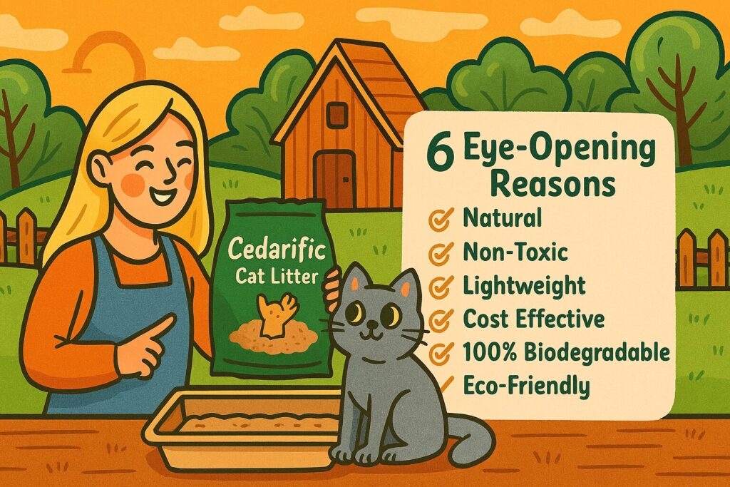 Many cat parents prefer Cedarific because it’s a low-dust cat litter that creates less mess and supports easier breathing. Unlike clay, Cedarific is natural, lightweight, and safer for sensitive cats who react to heavy perfumes or dust clouds.